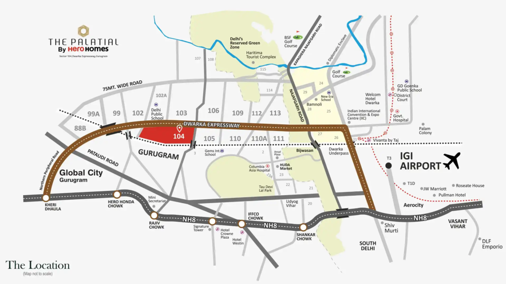 Hero Homes Palatial is located in Sector 104 Gurgaon along Dwarka Expressway, offering excellent connectivity to Delhi, IGI Airport, and major commercial hubs. The project enjoys proximity to schools, hospitals, and lifestyle destinations, making it ideal for modern urban living.